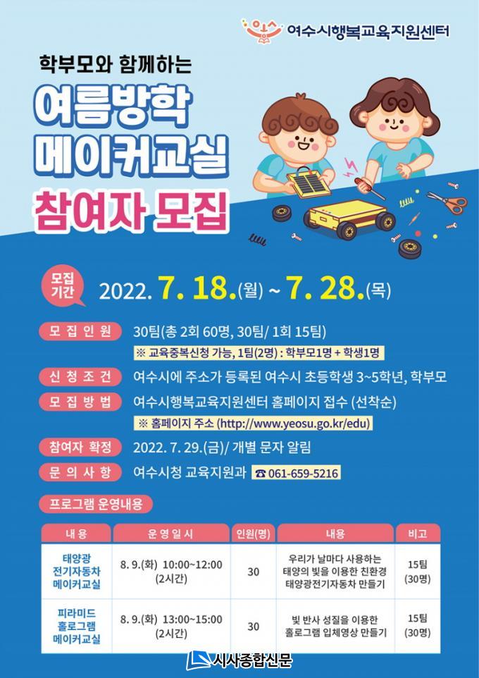 8¿ù 9ÀÏ ¿ÀÀü°ú ¿ÀÈÄ·Î ³ª´² ¿©¼ö½ÃÇູ±³À°Áö¿ø¼¾ÅÍ¿¡¼ ¡®Å¾籤 Àü±âÀÚµ¿Â÷¡¯, ¡®È¦·Î±×·¥ ÇǶó¹Ìµå¡¯ ¸¸µé±â·Î ÁøÇàµÉ ¿¹Á¤ÀÌ´Ù. ¸ðÁý ÀοøÀº °úÁ¤º° 30¸í¾¿(15ÆÀ) ÃÑ 60¸íÀ̸ç, ¼±Âø¼øÀ¸·Î ¸ðÁýÇÑ´Ù.7¿ù 18ÀϺÎÅÍ 28ÀϱîÁö ¿©¼ö½ÃÇູ±³À°Áö¿ø¼¾ÅÍ È¨ÆäÀÌÁö¿¡¼ ½ÅûÇÏ¸é µÈ´Ù.