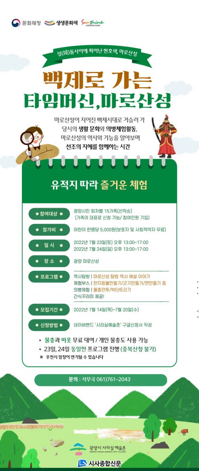 ¡®¹éÁ¦·Î °¡´Â ŸÀÓ¸Ó½Å, ¸¶·Î»ê¼º¡¯Àº 7¿ù 23, 24ÀÏ ¿ÀÈÄ 13~17½Ã 2ȸ °³ÃÖÇϸç, Âü¿© ½Åû µî ÀÚ¼¼ÇÑ »çÇ×Àº Æ÷½ºÅ͸¦ Âü°íÇϰųª ±¤¾ç½Ã»ç¶ó½Ç¿¹¼úÃÌ »ç¹«±¹À¸·Î ¹®ÀÇÇÏ¸é ¾Ë ¼ö ÀÖ´Ù.
