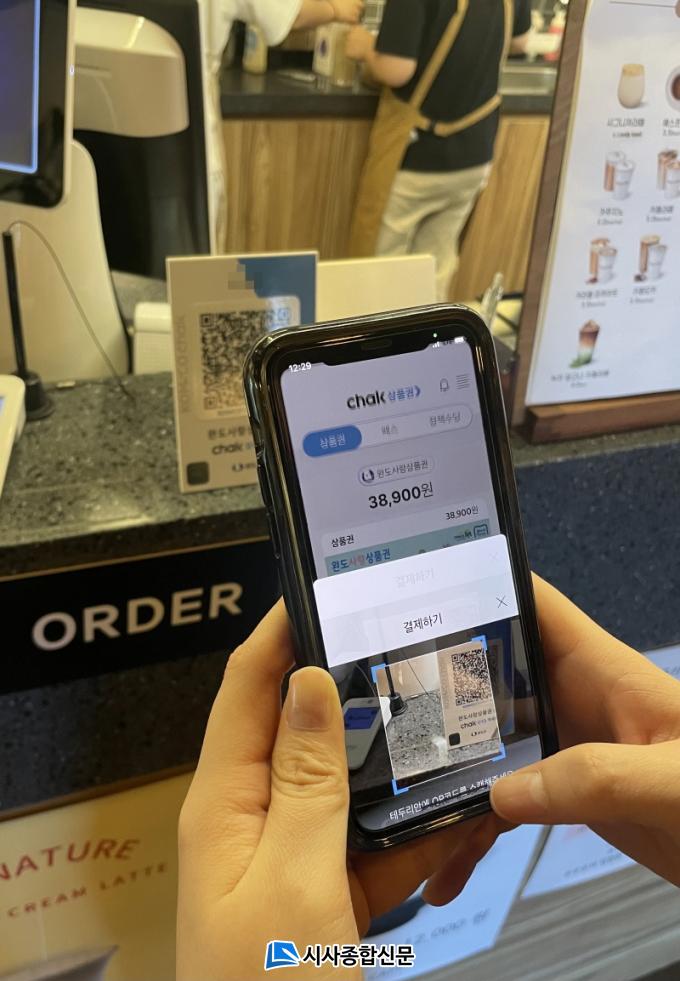¸ð¹ÙÀÏ ¿Ïµµ»ç¶û»óǰ±ÇÀº ½º¸¶Æ® ÆùÀ¸·Î °¡¸ÍÁ¡ÀÇ QR Äڵ带 Âï°í ±¸¸Å ¹°Ç°ÀÇ ±Ý¾×À» ÀÔ·ÂÇÑ µÚ Áö¹®À̳ª °£Æí ºñ¹Ð¹øÈ£(PIN)·Î ÀÎÁõÇÏ¸é °áÁ¦°¡ ¿Ï·áµÈ´Ù.