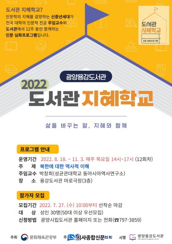 ±¤¾ç¿ë°µµ¼°üÀº Áö³ 4¿ù »ç¾÷ ¼öÇà±â°üÀ¸·Î ¼±Á¤µÆÀ¸¸ç, 2022³â ¡®µµ¼°ü ÁöÇýÇб³¡¯´Â 8¿ù 18ÀÏ~11¿ù 3ÀÏ ¸ÅÁÖ ¸ñ¿äÀÏ ¿ÀÈÄ 2½Ã ÃÑ 12ȸ¿¡ °ÉÃÄ Àι®ÇÐ ÇÁ·Î±×·¥ÀÌ ÁøÇàµÈ´Ù. ÇÁ·Î±×·¥ÀÇ ÁÖÁ¦´Â ¡®ºÏÇÑ¿¡ ´ëÇÑ ¿ª»çÀû ÀÌÇØ¡¯·Î ¼º±Õ°ü´ëÇб³ µ¿¾Æ½Ã¾Æ¿ª»ç¿¬±¸¼Ò ¹ÚâÈñ ±³¼ö°¡ °¿¬À» ÁøÇàÇÑ´Ù.