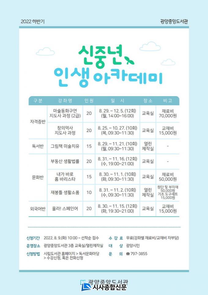 ±¤¾ç½Ã¿¡ °ÅÁÖÇÏ´Â ½ÅÁß³âÀ» ´ë»óÀ¸·Î ¿ÃÇØ 8~12¿ù ¡ã¸¶¼úµ¿È±¸¿¬Áöµµ»ç °úÁ¤(2±Þ) ¡ãâÀÇ¿ª»çÁöµµ»ç °úÁ¤ ¡ã±×¸²Ã¥ ¹Ì¼ú Ä¡À¯ ¡ãºÎµ¿»ê »ýȰ¹ý·ü ¡ã³»°¡ ¹Ù·Î Ȩ ¹Ù¸®½ºÅ¸ ¡ãÀçºÀƲ »ýȰ¼Òǰ ¡ã¿Ã¶ó! ½ºÆäÀÎ¾î µî 7°³ °Á¸¦ ¿î¿µÇÑ´Ù. ¼ö°·á´Â ¹«·áÀÌ¸ç °Áº°·Î Àç·áºñ¿Í ±³Àçºñ´Â ÀںδãÀ̰í, Æò¼Ò µµ¼°ü ÀÌ¿ëÀÌ ¾î·Á¿î Á÷ÀåÀÎÀ» À§ÇØ ¾ß°£ °Áµµ ÁøÇàÇÒ ¿¹Á¤ÀÌ´Ù.