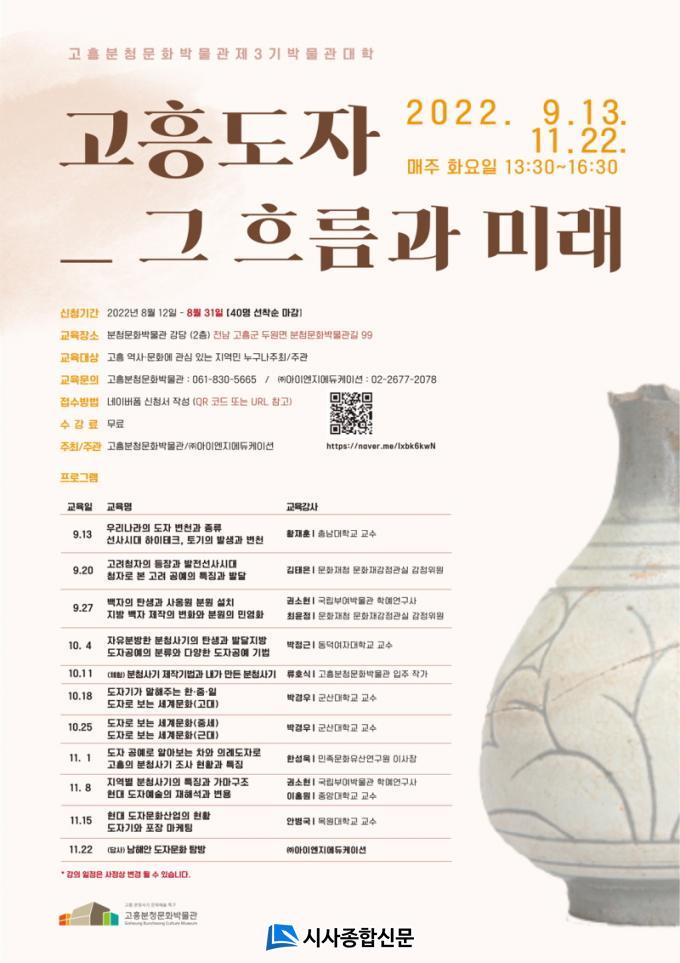 À̹ø ¹Ú¹°°ü ´ëÇÐÀº "°íÈï µµÀÚ-±× È帧°ú ¹Ì·¡: °íÈïÁö¿ª µµÀÚ º¯Ãµ°ú ºÐû»ç±â"¶ó´Â Á¦¸ñÀ¸·Î ¿À´Â 9¿ù 13ÀϺÎÅÍ 11¿ù 22ÀϱîÁö 10ÁÖ µ¿¾È ¸ÅÁÖ È¿äÀÏ ¿ÀÈÄ 1½Ã 30ºÐºÎÅÍ 4½Ã 30ºÐ±îÁö 1ÀÏ 2°Á¾¿ ¹Ú¹°°ü °´ç¿¡¼ ÁøÇàµÉ ¿¹Á¤À̸ç, ¿À´Â 8¿ù 12ÀϺÎÅÍ 9¿ù 7ÀϱîÁö ¼±Âø¼øÀ¸·Î ¼ö°»ýÀ» ¸ðÁýÇÑ´Ù.