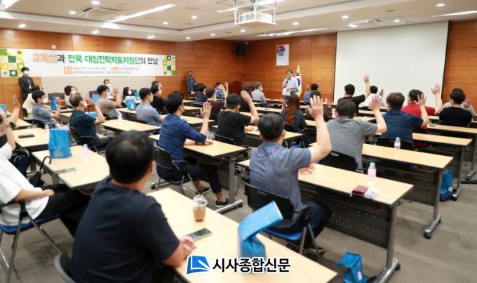 Àü¶óºÏµµ±³À°Ã»Àº 10ÀÏ ¿ÀÈÄ 7½Ã µµ±³À°Ã» 8Ãþ ȸÀǽǿ¡¼ ¡®¼°Å¼® ±³À°°¨°ú ÀüºÏ ´ëÀÔÁøÇÐÁöµµÁö¿ø´ÜÀÇ ¸¸³²¡¯Çà»ç¸¦ °®°í, ¾î·Á¿î ¿©°Ç ¼Ó¿¡¼ ÁøÇÐÁöµµ¸¦ ¸Ã°í ÀÖ´Â ¼±»ý´ÔµéÀ» À§·Î¡¤Ä¡ÇÏÇß´Ù.