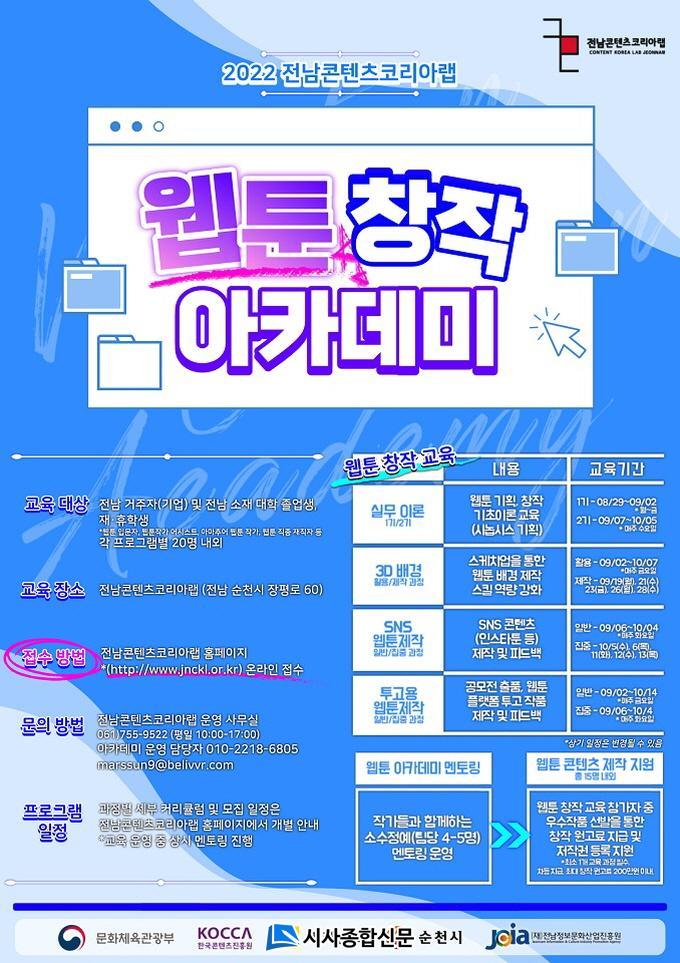Á¢¼ö´Â Àü³²ÄÜÅÙÃ÷ÄÚ¸®¾Æ·¦ ȨÆäÀÌÁö(www.jnckl.or.kr)¿¡¼ ¿Â¶óÀÎÀ¸·Î ½Åû °¡´ÉÇϸç, Ãß°¡ ±³À°°úÁ¤ ¸ðÁý ÀÏÁ¤ ¹× ±âŸ ÀÚ¼¼ÇÑ »çÇ×Àº ȨÆäÀÌÁö ¸ðÁý °ø°í¸¦ Âü°íÇϰųª ´ã´çÀÚ ÀüÈ(¢Ï061-755-9522)·Î ¹®ÀÇÇÏ¸é ¾È³»°¡ °¡´ÉÇÏ´Ù.
