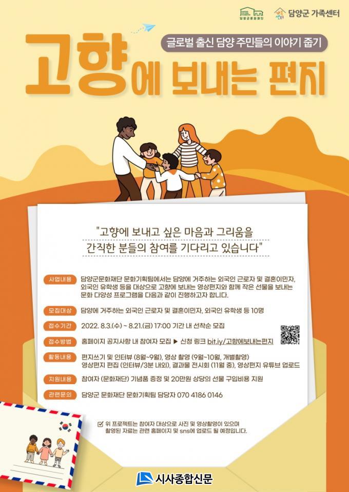 | ´ã¾ç±º, ¹®È ´Ù¾ç¼º ÇÁ·ÎÁ§Æ® ¡®°íÇâ¿¡ º¸³»´Â ÆíÁö¡¯ Âü¿©ÀÚ ¸ðÁý ´ã¾ç °ÅÁÖ ¿Ü±¹ÀÎ ´ë»ó ¿µ»ó Á¦ÀÛ ÇÁ·ÎÁ§Æ® |