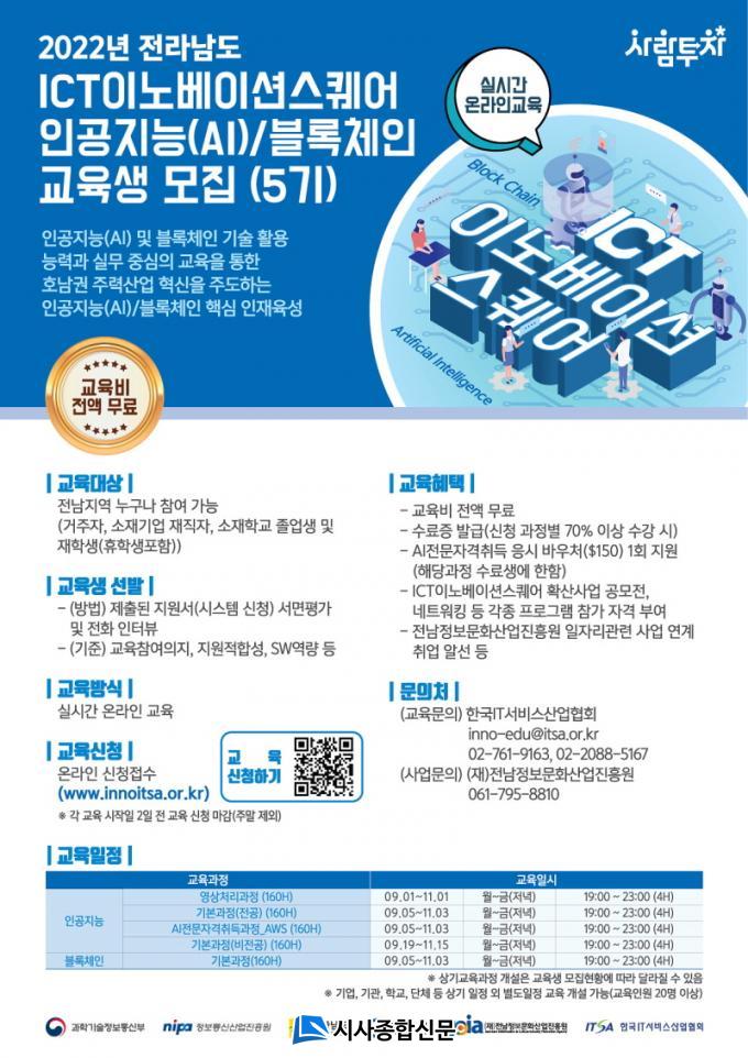 À̹ø 5±â ±³À°Àº ¡âÀΰøÁö´É ±âº»°úÁ¤(Àü°ø/ºñÀü°ø) ¡âAI Àü¹®ÀÚ°Ý Ãëµæ°úÁ¤(AWS) ¡âÀΰøÁö´É ¿µ»ó󸮰úÁ¤ ¡âºí·ÏüÀÎ ±âº»°úÁ¤ µî 5°³ °úÁ¤À¸·Î ¿À´Â 9¿ù 1ÀϺÎÅÍ °úÁ¤º° ÀÏÁ¤¿¡ µû¶ó ÁøÇàµÈ´Ù. ±³À°ºñ´Â Àü¾× ¹«·áÀ̰í ÀΰøÁö´É(AI)°ú ºí·ÏüÀο¡ °ü½ÉÀÌ ÀÖ´Â Àü³²µµ¹ÎÀÌ¸é ´©±¸³ª Àü³²ICTÀ̳뺣À̼ǽºÄù¾î ´©¸®Áý(www.innoitsa.or.kr)À» ÅëÇØ ½ÅûÇÒ ¼ö ÀÖÀ¸¸ç, ¼ö·áÀÚ´Â Ãë¾÷ ¿¬°è¸¦ Áö¿øÇÑ´Ù.