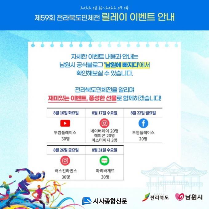 À̹ø ¸±·¹ÀÌ À̺¥Æ®´Â ³²¿ø½Ã °ø½Ä À¯Æ©ºê, ÀνºÅ¸±×·¥, ÆäÀ̽ººÏ, ºí·Î±× µî SNS ä³Î¿¡¼ ÁøÇàµÇ¸ç ³²¿ø½Ã °ø½Ä ºí·Î±× ¡®³²¿ø¿¡ ºüÁö´Ù¡¯¸¦ ÁÖÃàÀ¸·Î ¾È³»°¡ À̾îÁú ¿¹Á¤ÀÌ´Ù. Âü¿© ¹æ¹ýÀº ¸±·¹ÀÌ À̺¥Æ® ÁøÇà ÀÏÀÚ¿¡ ³²¿ø½Ã °ø½Ä ºí·Î±×¿¡¼ À¯Æ©ºê ÆÈ·Î¿ì‧ÁÁ¾Æ¿ä‧´ñ±Û ÀÎÁõ, ÀνºÅ¸±×·¥ ÀÀ¿ø ¸±½º 縰Áö, ÆäÀ̽ººÏ ÆÈ·Î¿ì‧ÀÀ¿øÇϱ⠵î À̺¥Æ® ³»¿ëÀ» È®ÀÎÇÏ¿© Âü¿©ÇÏ¸é µÈ´Ù.