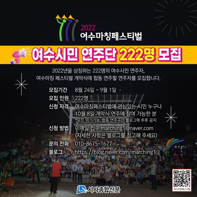 | 2022 ¿©¼ö¸¶ÄªÆä½ºÆ®¹ú °³¸·½Ä ÇÕµ¿ °ø¿¬¿¡ Âü¿©ÇÒ ¿©¼ö½Ã¹Î ¿¬ÁÖÀÚ 222¸íÀ» ¸ðÁýÇÑ´Ù. |