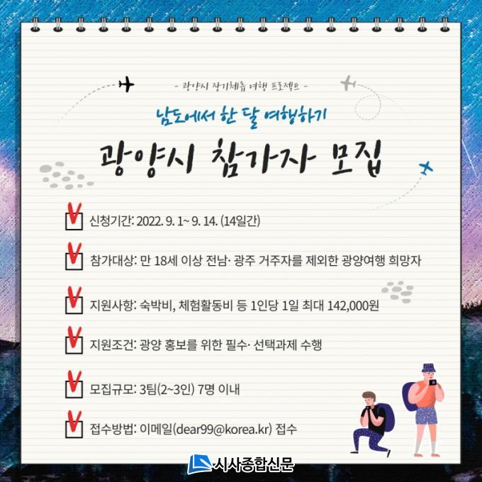 ÃÖÁ¾ ¼±Á¤µÈ ½ÅûÀÚ¿¡ ÇÑÇØ 9¿ù 21ÀÏ °³º° Å뺸 ¿¹Á¤À̸ç, Âü°¡ÀÚ´Â ¿ÃÇØ 11¿ù±îÁö ±¤¾çÀ» ¿©ÇàÇÏ°í °úÁ¦¸¦ ¼öÇàÇÏ¸é ¼÷¹Úºñ, üÇèȰµ¿ºñ µî ÇÏ·ç ÃÖ´ë 14¸¸ ¿øÀ» Áö¿ø¹ÞÀ» ¼ö ÀÖ´Ù. Áö¿ø±âÁØ, ½Åû¹æ¹ý µî ±¸Ã¼Àû »çÇ×Àº ½Ã ȨÆäÀÌÁö(gwangyang.go.kr) °øÁö»çÇ׿¡¼ È®ÀÎÇÒ ¼ö ÀÖ´Ù.