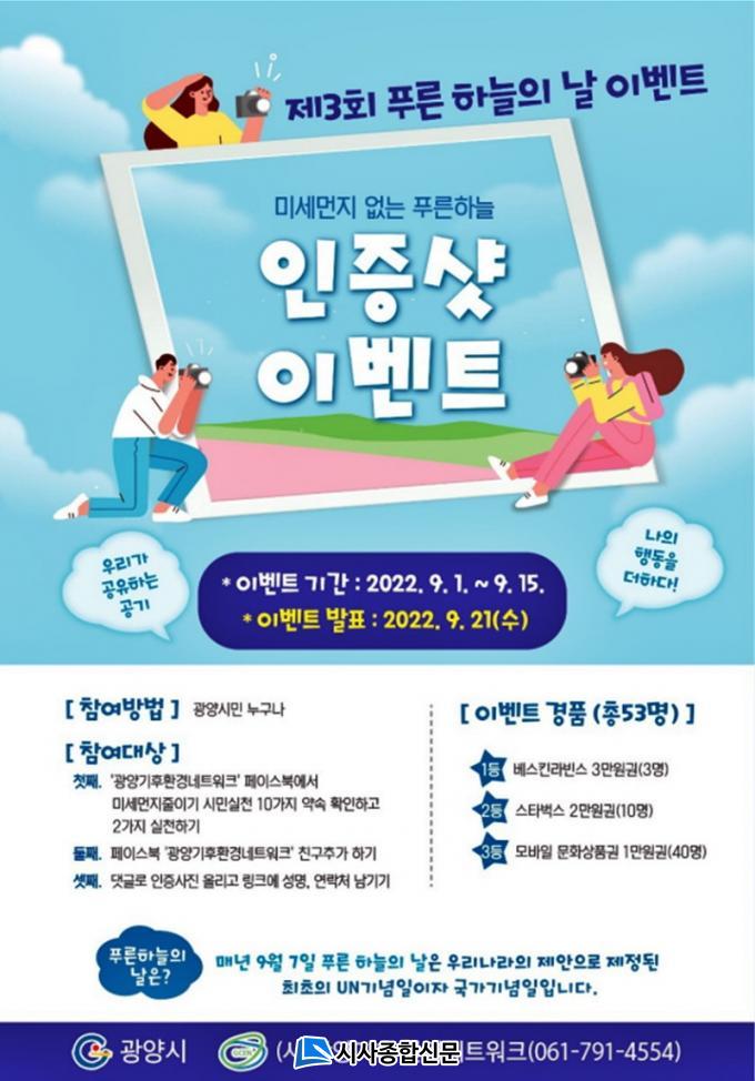 ±¹Á¦»çȸ´Â 2020³âºÎÅÍ ¸Å³â 9¿ù 7ÀÏ ¡®Çª¸¥ ÇÏ´ÃÀ» À§ÇÑ ¼¼°è ûÁ¤ ´ë±âÀÇ ³¯¡¯À» ±â³äÇÑ´Ù. ¡®¹Ì¼¼¸ÕÁö ¾ø´Â Ǫ¸¥ ÇÏ´Ã ÀÎÁõ¼¦ À̺¥Æ®¡¯´Â (»ç)Àü³²±¤¾ç±âÈÄ¡¤È¯°æ³×Æ®¿öÅ© ÆäÀ̽ººÏ¿¡ »ýȰ ¼Ó ¹Ì¼¼¸ÕÁö ÁÙÀ̱â 10°¡Áö ¾à¼ÓÀ» È®ÀÎÇϰí 2°¡Áö ½Çõ ÀÎÁõ»çÁøÀ» ¿Ã¸®¸é, Âü¿©ÀÚ °¡¿îµ¥ ÃÑ 53¸íÀ» ÃßÃ·ÇØ »óǰ±ÇÀ» ÁõÁ¤ÇÒ ¿¹Á¤ÀÌ´Ù.