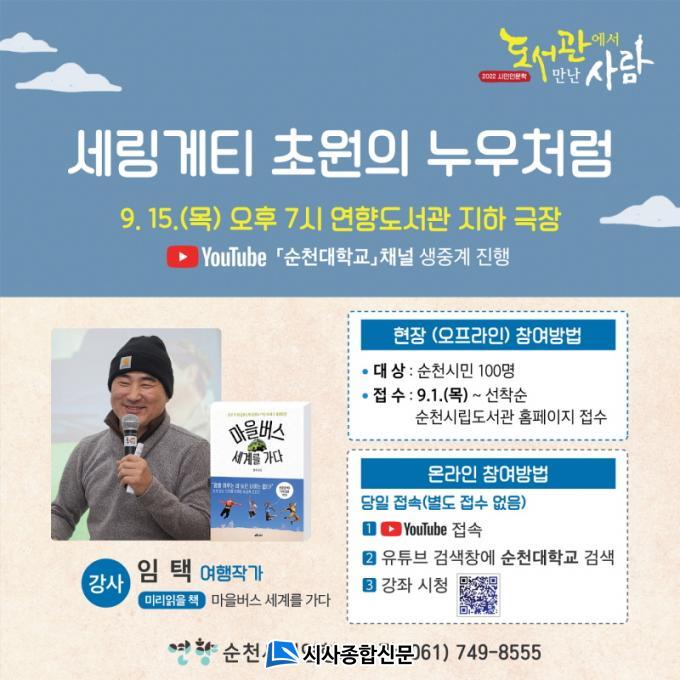 À̹ø °¿¬Àº ¿Â¡¤¿ÀÇÁ¶óÀÎÀ¸·Î µ¿½Ã¿¡ ÁøÇàÇÑ´Ù. ÇöÀå °¿¬ Âü¿©´Â 9¿ù 1ÀϺÎÅÍ ¼øÃµ½Ã¸³µµ¼°ü ´©¸®Áý¿¡¼ »çÀü ½ÅûÇÏ¸é µÇ°í, ¿Â¶óÀÎ »ý¹æ¼Û Âü¿©´Â »çÀü ½Åû ¾øÀ̵µ À¯Æ©ºê ¡®¼øÃµ´ëÇб³¡¯Ã¤³Î¿¡¼ ½Ç½Ã°£ ½ÃûÀÌ °¡´ÉÇÏ´Ù.