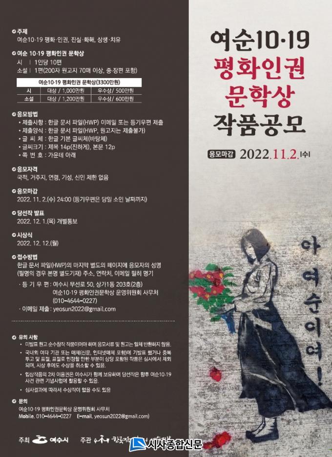 11¿ù 2ÀϱîÁö ÀüÀÚ¿ìÆí(yeosun2022@gamil.com) ¶Ç´Â µî±â¿ìÆí(¿©¼ö½Ã ¹«¼±·Î 50 »ó°¡1µ¿ 203È£, ¿©¼ø10‧19 ÆòÈÀαǹ®Çлó ¿î¿µÀ§¿øÈ¸)À¸·Î Á¦ÃâÇÏ¸é µÈ´Ù.