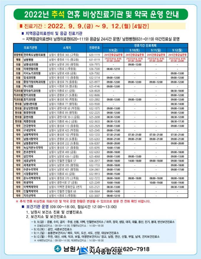 Ãß¼® ¿¬ÈÞ ±â°£ µ¿¾È Áö¿ªÀÀ±ÞÀÇ·á¼¾ÅÍÀÎ Àü¶óºÏµµ ³²¿øÀÇ·á¿øÀº(620-1114)