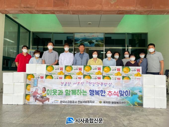 À̳¯ »ç¶û¹è´ÞºÎ·Î Âü¿©ÇÑ Á÷¿øµéÀº ¼ÛÆí(5kg) 23¹Ú½º¿Í ¹è 23¹Ú½º¸¦ ¸¶À»·Î Àü´ÞÇÏ¸ç ¡°Ãß¼®À» ¸Â¾Æ Á¤¼º²¯ ÁغñÇÑ ¼ÛÆí°ú °úÀÏÀ» µå½Ã°í ¾î¸£½Åµé²²¼ °Ç°ÇϼÌÀ¸¸é ÇÑ´Ù¡±¸ç ¡°Á¤ÀÌ ³ÑÄ¡´Â Áö¿ª»çȸ ºÐÀ§±â Á¶¼ºÀ» À§ÇØ ¾î¸£½ÅµéÀÇ ¼Õ°ú ¹ßÀÌ µÇ´Â »ç¶û¹è´ÞºÎ°¡ µÇ°Ú´Ù¡±°í ¸»Çß´Ù.