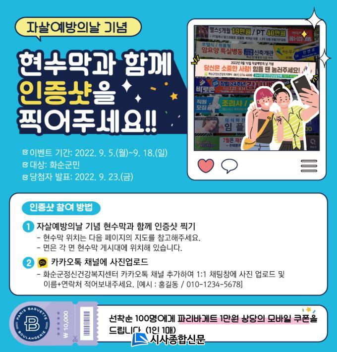 À̺¥Æ® Âü¿© Èñ¸ÁÀÚ´Â Àڻ쿹¹æÀÇ ³¯ ±â³ä Çö¼ö¸·°ú ÇÔ²² ÀÎÁõ¼¦À» Âï¾î ¡®È¼ø±ºÁ¤½Å°Ç°º¹Áö¼¾ÅÍ Ä«Ä«¿ÀÅå ä³Î¡¯ 1:1 äÆÃâ¿¡ »çÁøÀ» ¾÷·ÎµåÇÏ¸é µÈ´Ù. Çö¼ö¸· À§Ä¡´Â ȼø±ºÁ¤½Å°Ç°º¹Áö¼¾ÅÍ Ä«Ä«¿ÀÅå ä³ÎÀ̳ª ´©¸®Áý¿¡ ¾È³»µÇ¾î ÀÖÀ¸¸ç, ¼±Âø¼ø 100¸í¿¡°Ô´Â ¼ÒÁ¤ÀÇ »óǰÀÌ Á¦°øµÈ´Ù.