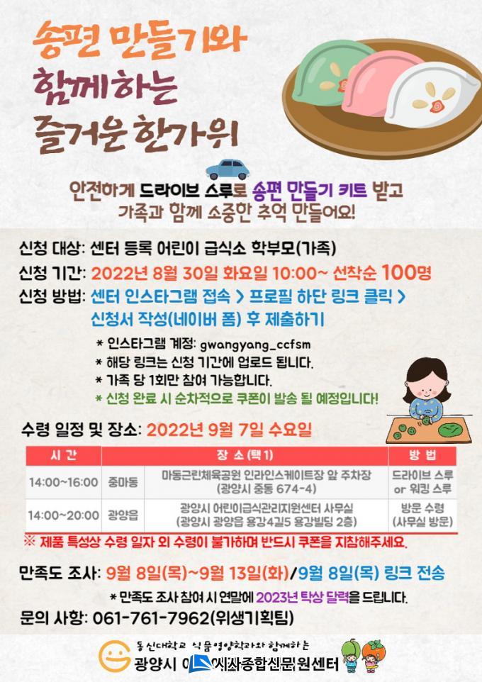 [½Ã»çÁ¾ÇսŹ® = Àå¹Î±Ô ±âÀÚ] ±¤¾ç½Ã°¡ µ¿½Å´ëÇб³ »êÇÐÇù·Â´Ü¿¡ À§Å¹ ¿î¿µ ÁßÀÎ ±¤¾ç½Ã ¾î¸°À̱޽İü¸®Áö¿ø¼¾ÅÍ(¼¾ÅÍÀå À̼۹Ì, µ¿½Å´ëÇб³ ½Äǰ¿µ¾çÇаú ±³¼ö)´Â Áö³ 7ÀÏ Ãß¼®À» ¸Â¾Æ °¡Á·°ú ¼ÒÁßÇÑ Ãß¾ïÀ» ½×À» ¼ö ÀÖµµ·Ï 100¸í °¡Á·À» ´ë»óÀ¸·Î ¡®¼ÛÆí ¸¸µé±â ŰƮ¡¯¸¦ Àü´ÞÇß´Ù.