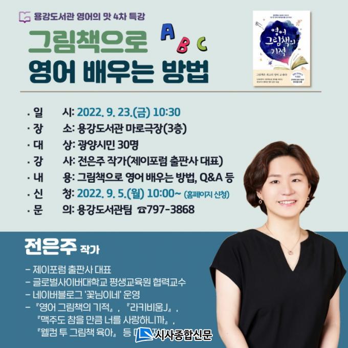 | ±¤¾ç¿ë°µµ¼°ü, ºÎ¸ð ´ë»ó ¿µ¾î±³À° Ư° ¸¶·Ã 9¿ù 23ÀÏ, ¡®±×¸²Ã¥À¸·Î ¿µ¾î ¹è¿ì´Â ¹æ¹ý¡¯ ÁÖÁ¦·Î ÀüÀºÁÖ ÀÛ°¡ °¿¬ |