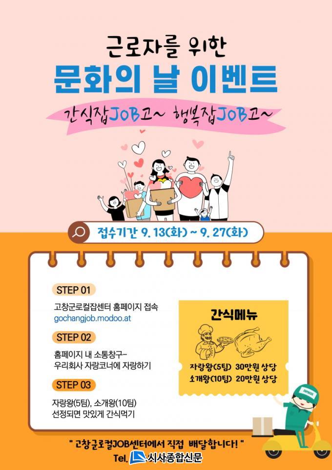 °ü³» ±Ù·ÎÀÚ°¡ °íⱺ·ÎÄÃJOB¼¾ÅÍ È¨ÆäÀÌÁö(https://gochangjob.modoo.at)¸¦ ¹æ¹®ÇÏ¿© ¡®¿ì¸® ȸ»ç ÀÚ¶û Äڳʡ¯¸¦ ÅëÇØ ±â¾÷¿¡ ´ëÇÑ »ç¿¬À̳ª ÀÚ¶ûÀ» ³²±â¸é ±×Áß 15°³ »ç¿¬À» ¼±¹ßÇÏ¿© ÀÚ¶û¿Õ 5°³ ÆÀ¿¡°Ô´Â 30¸¸¿ø »ó´ç, ¼Ò°³¿Õ 10°³ ÆÀ¿¡°Ô´Â 20¸¸¿ø »ó´çÀÇ °£½ÄÀ» ÀÏÅÍ·Î Á÷Á¢ Àü´ÞÇÑ´Ù.