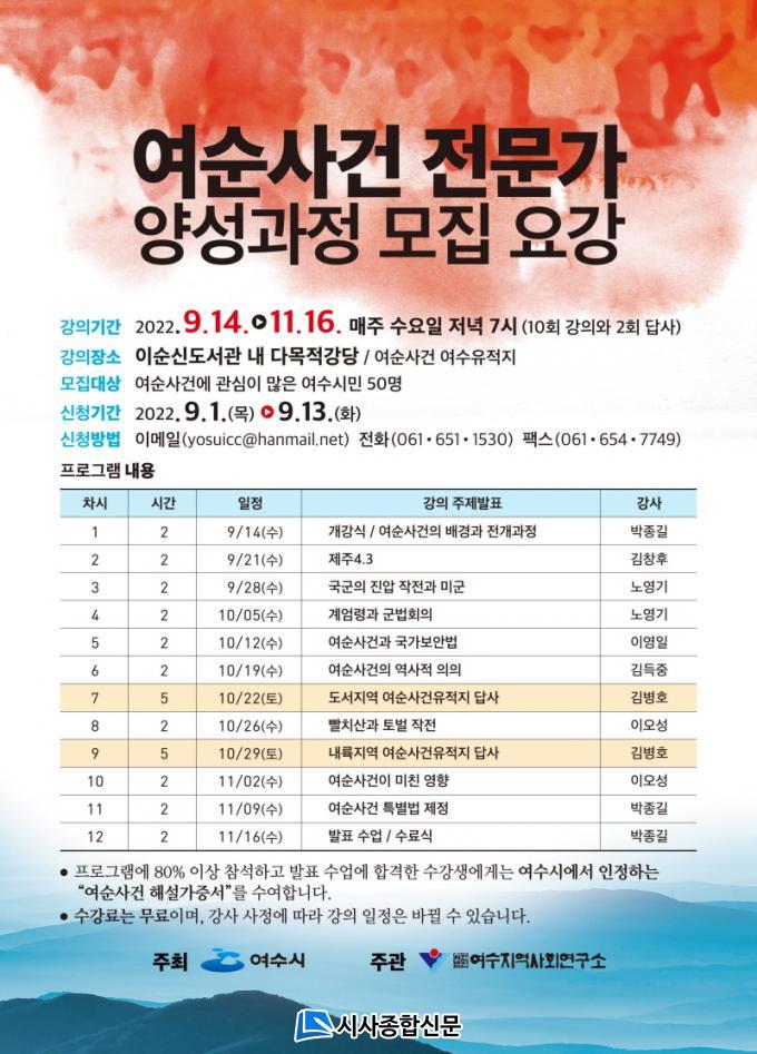 9¿ù 14ÀϺÎÅÍ 11¿ù 16ÀϱîÁö ¸ÅÁÖ ¼ö¿äÀÏ Àú³á 7½Ã¿¡ À̼ø½Åµµ¼°ü ´Ù¸ñÀû°´ç¿¡¼ ÁøÇàµÇ¸ç, ±â ¸ðÁýÇÑ 55¸íÀÇ ¼ö°»ýÀÌ Âü¿©ÇÏ°Ô µÈ´Ù. 14ÀÏ Ã¹ °ÀÇ ¡®¿©¼ø»ç°ÇÀÇ ¹è°æ°ú Àü°³°úÁ¤¡¯À» ½ÃÀÛÀ¸·Î, 12Â÷½Ã¿¡ °ÉÃÄ À̷аú ÇöÀåÇнÀÀ» º´ÇàÇÑ ±³À°ÀÌ ½Ç½ÃµÉ ¿¹Á¤ÀÌ´Ù.