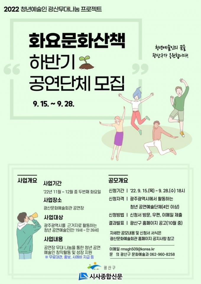 ±¤»ê±¸´Â 2017³â ÆÄÀÏ·µ ÇÁ·Î±×·¥À» ½ÃÀÛÀ¸·Î ¡®È¿ä¹®È»êÃ¥¡¯À» ÅëÇØ Áö±Ý±îÁö ÃÑ 42°³ ´Üü¸¦ Áö¿øÇß´Ù. ¿ÃÇØ´Â ¼ö¿Ï¹®ÈüÀ°¼¾ÅÍ °ø¿¬Àå(312¼® ±Ô¸ð) ¹«´ë±îÁö °ø°£À» È®ÀåÇÏ´Â µî û³â¿¹¼úÀε鿡°Ô ´Ù¾çÇÑ ¹«´ë¸¦ Áö¿øÇϰí ÀÖ´Ù. ¿ÃÇØ ÇϹݱ⠰ø¿¬Àº ±¤»ê¹®È¿¹¼úȸ°ü¿¡¼ 2ȸ ÁøÇàÇÒ ¿¹Á¤ÀÌ´Ù. °ø¸ð ½ÅûÀ» ¹ÞÀº ÈÄ ½É»ç¸¦ °ÅÃÄ 2°³ û³â¿¹¼ú´Üü¸¦ ¼±Á¤ÇÑ´Ù.