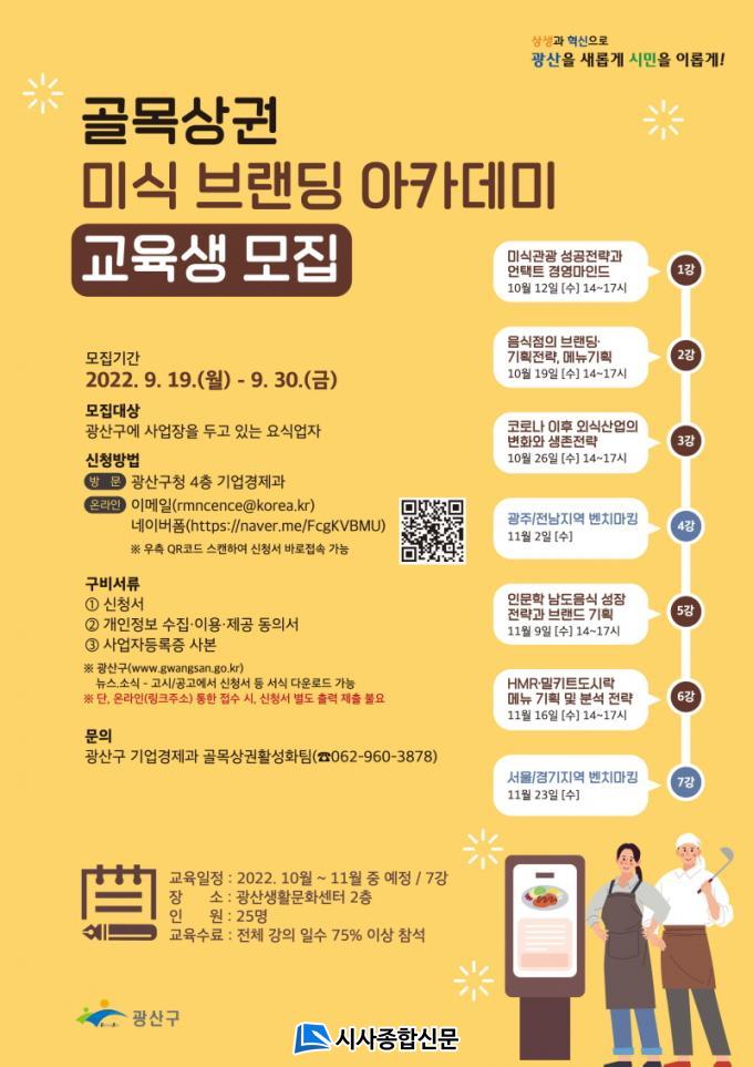 Àü¹®±³À°±â°üÀ» ÅëÇØ 10¿ùºÎÅÍ 7ÁÖ µ¿¾È ±¤»ê»ýȰ¹®È¼¾ÅÍ 2Ãþ(±¤»ê±¸ »ó¹«´ë·Î 265, ¼ÒÃ̵¿)¿¡¼ ¡âºñ´ë¸é½Ã´ë °æ¿µ¸¶ÀÎµå ¡âºê·£µù ±âȹ ¡â¿Ü½Ä»ê¾÷ º¯È¿Í »ýÁ¸Àü·« ¡â¸Þ´º ±âȹ¡¤ºÐ¼® ¡â¼±ÁøÁö °ßÇÐ µî ¿Ü½Ä¾÷ Æ¯È ±³À°À» ÁøÇàÇÑ´Ù.