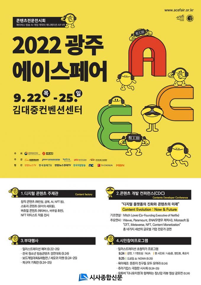 2022 ±¤ÁÖ ¿¡À̽º Æä¾î´Â ±¤ÁÖ±¤¿ª½Ã¿Í ¹®ÈüÀ°°ü±¤ºÎ°¡ ÁÖÃÖÇÏ°í ±è´ëÁßÄÁº¥¼Ç¼¾ÅÍ, ±¤ÁÖÁ¤º¸¹®È»ê¾÷ÁøÈï¿ø, Çѱ¹ÄÉÀ̺íTV¹æ¼ÛÇùȸ, ±¤ÁÖµðÀÚÀÎÁøÈï¿ø, ´ëÇѹ«¿ªÅõÀÚÁøÈï°ø»ç(KOTRA)°¡ ÁÖ°üÇÏ´Â Çà»ç·Î ¿ÃÇØ·Î 17ȸ°¸¦ ¸Â¾Ò´Ù.