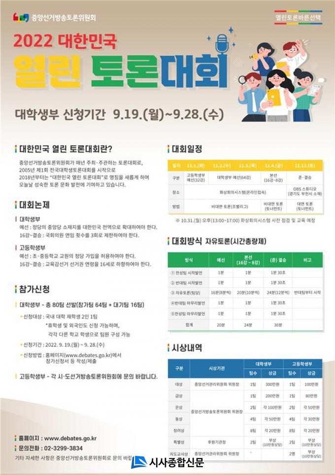 2005³â¿¡ ½ÃÀÛµÇ¾î ´ëÇ¥ÀûÀΠû¼Ò³â Åä·Ð´ëȸ·Î ÀÚ¸® ÀâÀº À̹ø ´ëȸ´Â ´ëÇлýºÎ¿Í °íµîÇлýºÎ·Î ³ª´©¾î °³ÃֵǸç, ´ëÇлýºÎ´Â 9¿ù 19ÀϺÎÅÍ 28ÀϱîÁö Áß¾Ó¼±°Å¹æ¼ÛÅä·ÐÀ§¿øÈ¸ ȨÆäÀÌÁö(www.debates.go.kr)¸¦ ÅëÇØ Âü°¡ ½ÅûÀ» ÇÒ ¼ö ÀÖ°í, °íµîÇлýºÎ´Â °¢ ½Ã¡¤µµ¼±°Å¹æ¼ÛÅä·ÐÀ§¿øÈ¸¿¡¼ Âü°¡ÆÀ ¼±¹ßÀüÀ» °³ÃÖÇϰí ÀÖ´Ù.