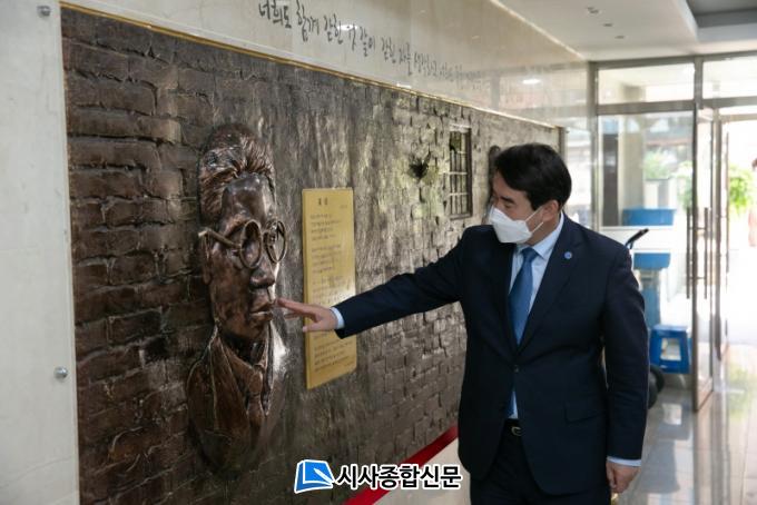 ÀÌ ±³À°°¨Àº »ï´ö±³È¸ ÀÔ±¸¿¡ ¼³Ä¡µÈ ´ë±¸Çü¹«¼Ò »ó¡ Á¶Çü¹° ¾Õ¿¡¼ ¼ø±¹ ÀǺ´Àå°ú Ç×Àϵ¶¸³¿îµ¿°¡µéÀ» ±â¸®¸ç ÇåÈÇÏ°í ¹¬³äÇß´Ù. »ó¡Á¶Çü¹°Àº ¿¾ ´ë±¸°¨¿Á°ú ´ë±¸Çü¹«¼Ò ¶§ »ç¿ëµÈ ºÓÀº º®µ¹·Î ¸¸µç ´ãº®À¸·Î, º®µ¹¿¡´Â È£³² ÀǺ´ÀåµéÀÇ À̸§ÀÌ Èò»ö ÆäÀÎÆ®·Î ¾º¿© ÀÖ´Ù.