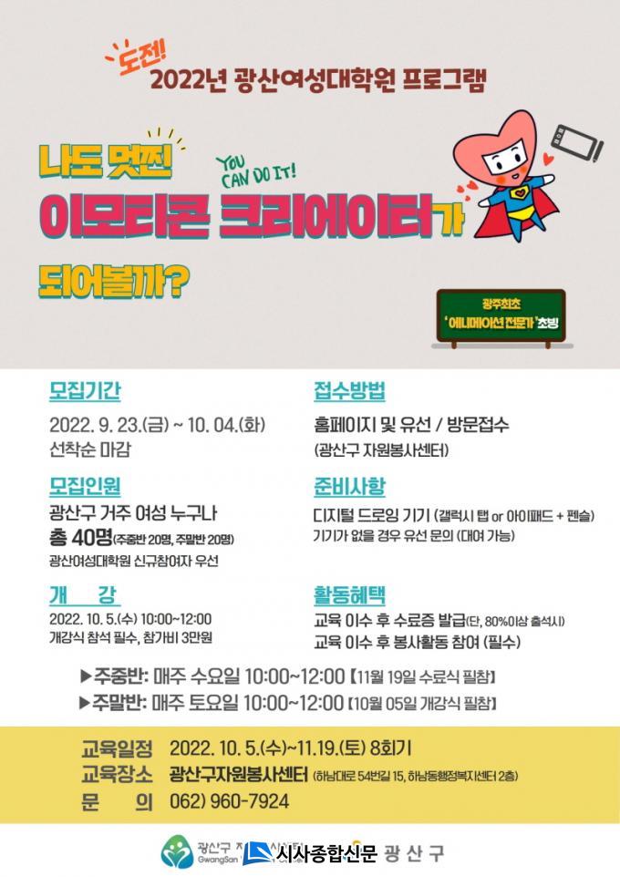 [½Ã»çÁ¾ÇսŹ® = ¿À½ÂÅà ±âÀÚ] ±¤ÁÖ±¤¿ª½Ã ±¤»ê±¸ÀÚ¿øºÀ»ç¼¾ÅÍ(¼¾ÅÍÀå ÁÖ¼º¾Æ)´Â ±¤»ê¿©¼º´ëÇпø ¡°À̸ðƼÄÜ Å©¸®¿¡ÀÌÅÍ ¾ç¼º°úÁ¤¡±±³À°»ýÀ» 2022³â 9¿ù 23ÀϺÎÅÍ ¼±Âø¼ø ¸ðÁýÇÑ´Ù°í ¹àÇû´Ù.