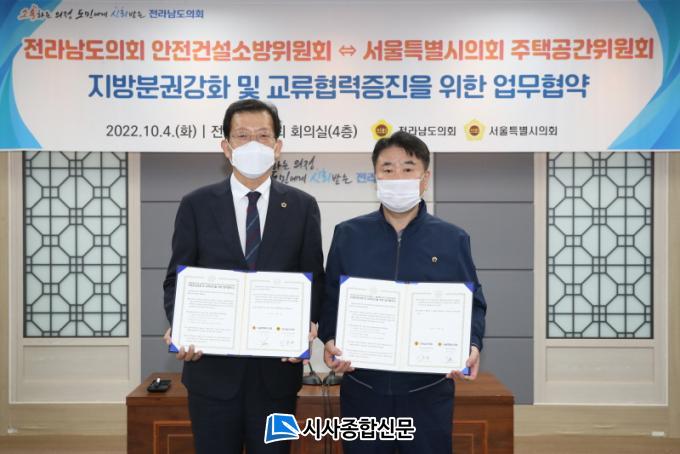 [½Ã»çÁ¾ÇսŹ® = ¿À½ÂÅà ±âÀÚ] Àü¶ó³²µµÀÇȸ ¾ÈÀü°Ç¼³¼Ò¹æÀ§¿øÈ¸(À§¿øÀå À̵¿Çö)´Â 4ÀÏ µµÀÇȸ ȸÀǽÇ(4Ãþ)¿¡¼ ¼¿ïƯº°½ÃÀÇȸ ÁÖÅðø°£À§¿øÈ¸(À§¿øÀå ¹Îº´ÁÖ)¿Í Áö¹æºÐ±Ç°È ¹× ±³·ùÇù·ÂÁõÁøÀ» À§ÇØ ¾÷¹«Çù¾àÀ» ü°áÇß´Ù.
