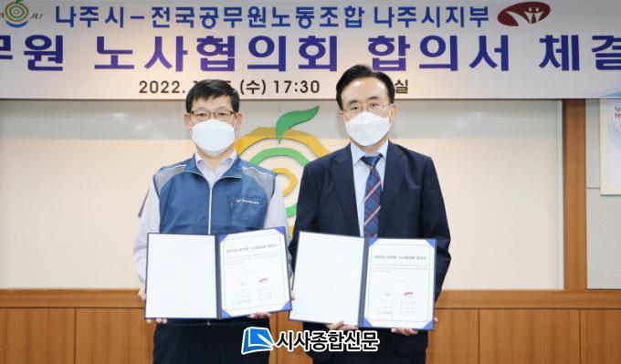 ³ªÁÖ½Ã(½ÃÀå À±º´ÅÂ)´Â Áö³ 5ÀÏ ½Ãû»ç ÀÌȽǿ¡¼ °ø¹«¿ø³ëÁ¶ ³ªÁÖ½ÃÁöºÎ(ÁöºÎÀå ÀÓÁø±¤)¿Í ¡®2022³â °ø¹«¿ø ³ë»çÇùÀÇȸ ÇÕÀǼ¡¯¸¦ ü°áÇß´Ù°í 6ÀÏ ¹àÇû´Ù.