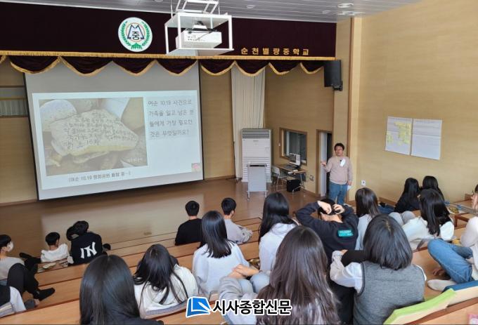 Áö³ 13ÀÏ ¼øÃµº°·®ÁßÇб³´Â 3Çгâ Çлýµé¿¡°Ô ¿©¼ø10.19 ÆòÈÀαDZ³À°À» ÁøÇàÇß´Ù. 1±³½ÃºÎÅÍ 4±³½Ã±îÁö ÁøÇàµÈ ¿©¼ø10.19 ±³À°Àº ¹Ú·¡ÈÆ ¿ª»ç±³»ç¿¡°Ô ¿©¼ø10.19»ç°Ç¿¡ ´ëÇØ ±âº»ÀûÀÎ ³»¿ëÀ» ¹è¿ì´Â ½Ã°£À» °¡Áø ÀÌÈÄ, ¿©¼ø10.19 À¯Á·ÀÎ ±ÇÁ¾±¹ ¾¾¿Í ÇлýµéÀÇ ¸¸³²À¸·Î À̾îÁ³´Ù.