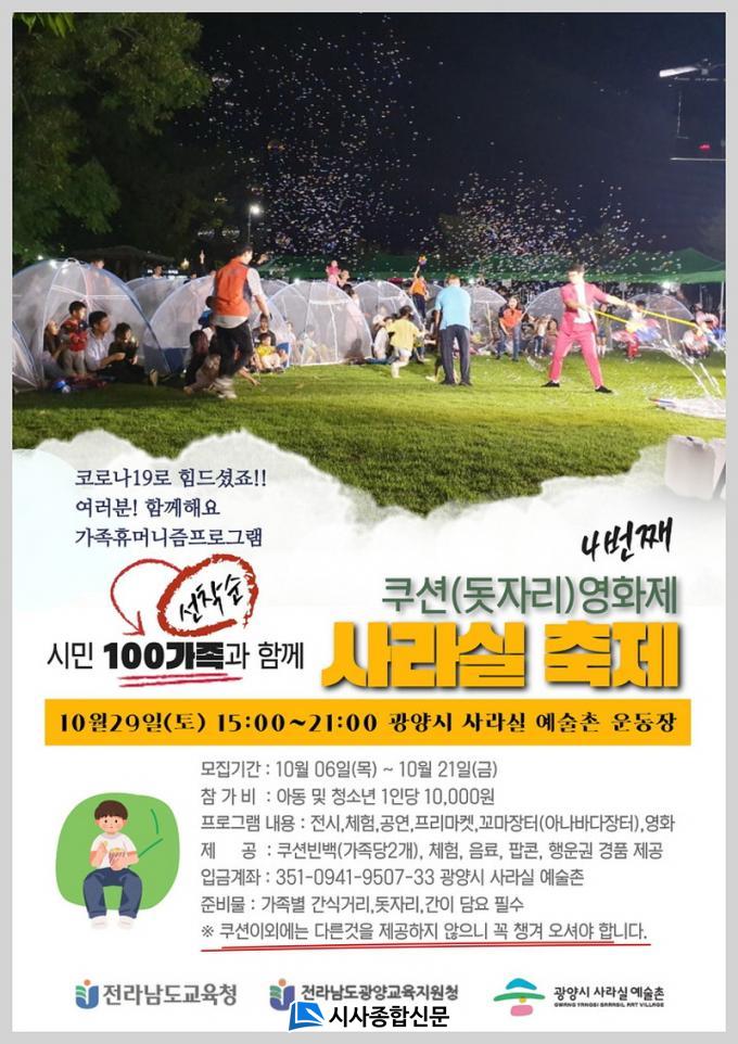 Äí¼Ç ¿µÈÁ¦ Âü°¡ Á¢¼ö´Â ¹êµå¿Í ȨÆäÀÌÁö µîÀ» ÅëÇØ 10¿ù 21ÀϱîÁö ¼±Âø¼øÀ¸·Î Á¢¼öÇϰí ÀÖÀ¸¸ç, ÀÚ¼¼ÇÑ ¹®ÀÇ»çÇ×Àº ±¤¾ç½Ã »ç¶ó½Ç¿¹¼úÃÌ(¢Ï061-762-2043)À¸·Î ÇÏ¸é µÈ´Ù.