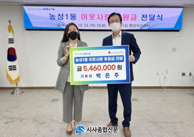 ¹ÚÀºÁÖ °æÀ§´Â ¿ÃÇØ ¾î·Á¿î ¿©°ÇÀ» µó°í ºÀ»çÇÏ´Â °æÂû°ü µîÀÇ °øÀûÀ» ±â¸®´Â ¡®Ã»·æºÀ»ç»ó¡¯¿¡¼ ½Å(ãá)»óÀ» ¼ö»óÇߴµ¥, ±× ºÎ»óÀ¸·Î ¹ÞÀº »ó±Ý Àü¾×(546¸¸¿ø)À» 7³â Àü Àο¬À» ¸Î¾ú´ø ±âÃʼö±ÞÀÚ A¾¾¿¡°Ô ÈÄ¿øÇß´Ù.