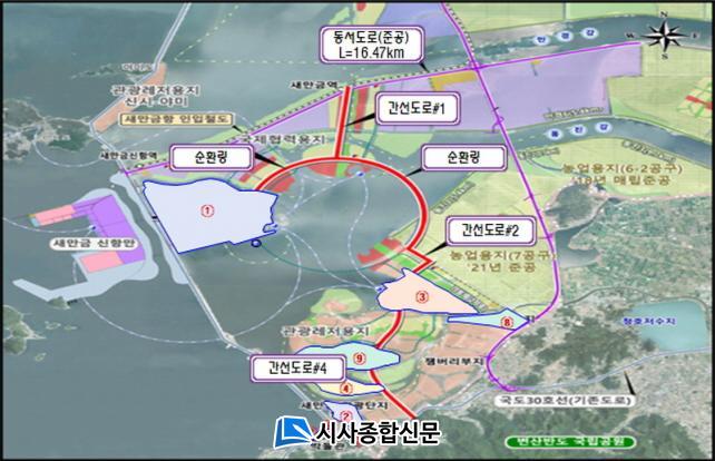 »õ¸¸±Ý Áö¿ª°£ ¿¬°áµµ·Î´Â ºÎ¾È±º Çϼ¸é ±¹µµ 30È£¼±¿¡¼ºÎÅÍ Àë¹ö¸®ºÎÁö, ȯ°æ»ýÅ¿ëÁö, °ü±¤·¹Á®¿ëÁö, ³ó¾÷¿ëÁö(7°ø±¸), ¼øÈ¯¸µ, ±¹Á¦Çù·Â¿ëÁö¸¦ °æÀ¯ÇÏ¿© »õ¸¸±Ý ³»ºÎ ½ÊÀÚ°£¼±¸ÁÀÎ µ¿¼µµ·Î±îÁö 20.7km¿¡ ÃÑ 1Á¶ 554¾ï¿øÀ» ÅõÀÚÇÏ¿© 6Â÷·Î·Î °Ç¼³ÇÏ´Â »ç¾÷ÀÌ´Ù.