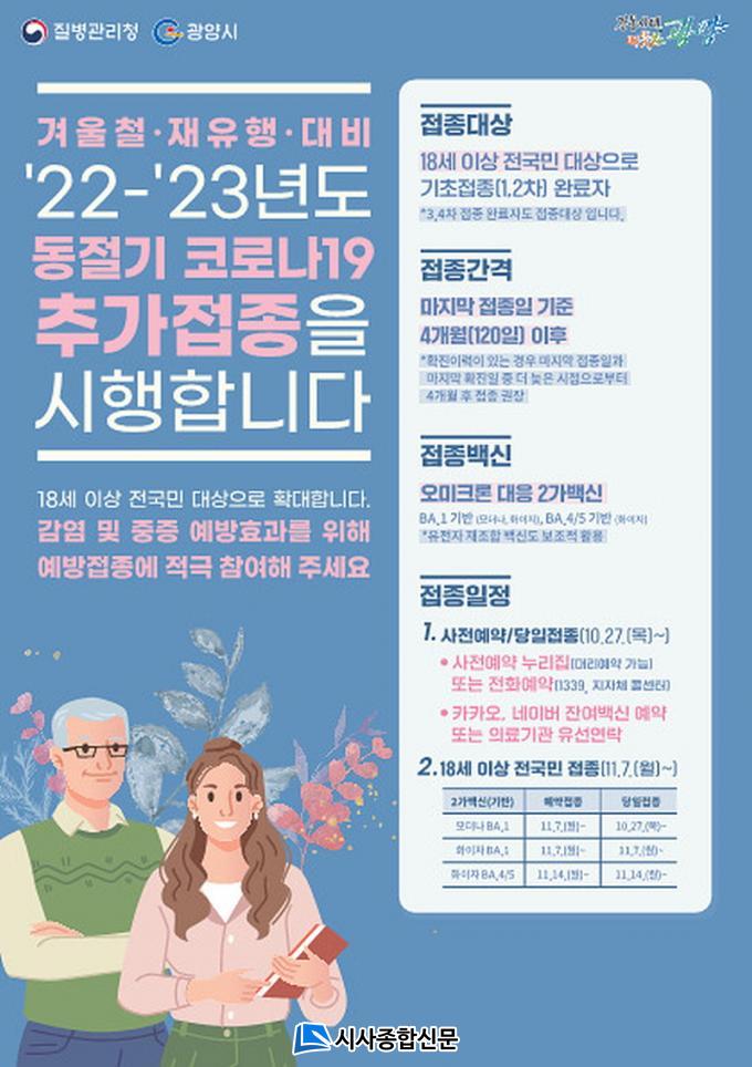 À̹ø¿¡ È®´ë ½ÃÇàµÇ´Â µ¿Àý±â Äڷγª19 Ãß°¡Á¢Á¾¿¡¼´Â 18¼¼ ÀÌ»ó ±âÃÊÁ¢Á¾(1¡¤2Â÷)À» ¿Ï·áÇÑ ÀÚ ´©±¸³ª »çÀü ¿¹¾àÀÌ °¡´ÉÇϸç, ¼±ÅÃÇÒ ¼ö ÀÖ´Â 2°¡¹é½ÅÀÇ Á¾·ùµµ ¼¼ Á¾·ù(¸ð´õ³ª BA.1, ÈÀÌÀÚ BA.1, ÈÀÌÀÚ BA.4/5)·Î È®´ëµÈ´Ù. Á¢Á¾°£°ÝÀº ¸¶Áö¸· Á¢Á¾ ¶Ç´Â È®ÁøÀÏ ±âÁØ 4°³¿ù(120ÀÏ)ÀÌ Áö³ ½ÃÁ¡ºÎÅÍÀÌ´Ù.