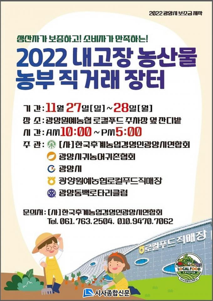 [½Ã»çÁ¾ÇսŹ® = Àå¹Î±Ô ±âÀÚ] ±¤¾ç½Ã´Â Çѱ¹³ó¾÷°æ¿µÀÎ ±¤¾ç½Ã¿¬ÇÕȸ(ȸÀå À̱â¿í), ±¤¾ç½Ã ±Í³ó¾î±ÍÃÌÇùȸ(ȸÀå À¯±Ý¼÷) ÁÖÃÖ¡¤ÁÖ°üÀ¸·Î ¡®2022³â ³» °íÀå ³ó»ê¹° ³óºÎ Á÷°Å·¡ÀåÅÍ¡¯¸¦ ±¤¾ç¿ø¿¹³óÇù ·ÎÄÃǪµå ÁÖÂ÷Àå ¿· Àܵð¹ç¿¡¼ ¿À´Â 27~28ÀÏ(2Àϰ£) ¿î¿µÇÑ´Ù.
