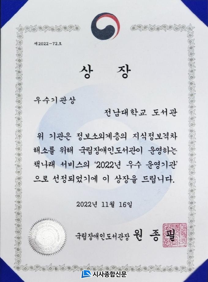 Àü³²´ëµµ¼°ü(°üÀå Àå¿ì±Ç)Àº Áö³ 11¿ù 16ÀÏ ±¹¸³Àå¾ÖÀεµ¼°ü(°üÀå ¿øÁ¾ÇÊ)ÀÌ ÁÖ°üÇÏ´Â 「2022³â µµ¼°ü Àå¾ÖÀÎ ¼ºñ½º À¯°øÀÚ ½Ã»ó½Ä」¿¡¼ Ã¥³ª·¡ ¼ºñ½º ¿ì¼ö±â°ü»óÀ» ¼ö»óÇß´Ù.