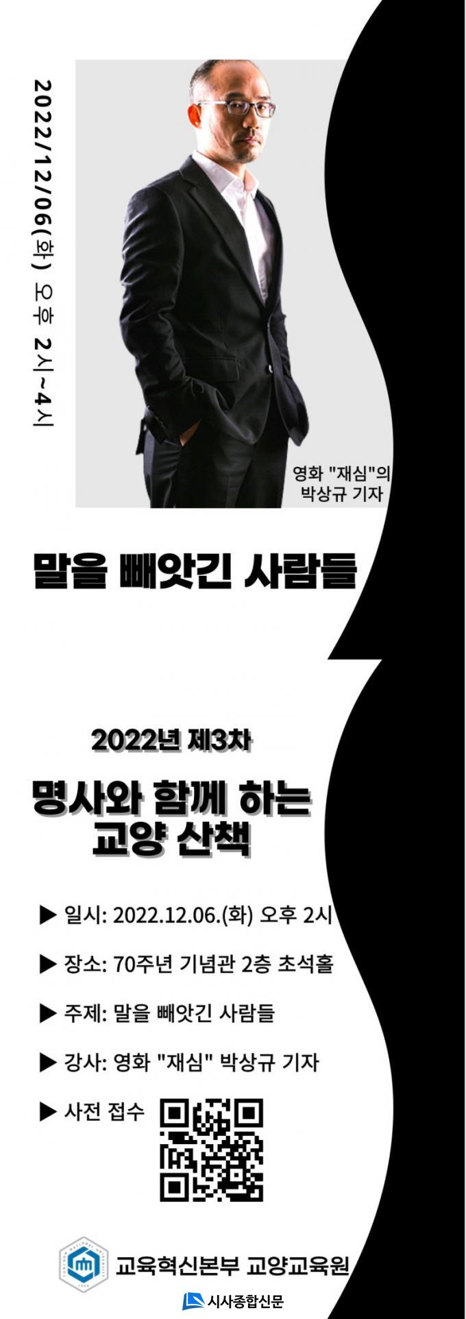 [½Ã»çÁ¾ÇսŹ® = Àå¹Î±Ô ±âÀÚ] ±¹¸³ ¼øÃµ´ëÇб³(ÃÑÀå °í¿µÁø)´Â Áö¿ª¹ÎÀÇ ¹®È °¨¼ö¼ºÀ» È®´ëÇϰí Àι®ÇÐÀû ¼Ò¾çÀ» ¹è¾çÇϰíÀÚ ´Ù°¡¿À´Â 12¿ù 6ÀÏ, ¡¸Áö¿¬µÈ Á¤ÀÇ¡¹ÀÇ ÀúÀÚÀÌÀÚ ¿µÈ ¡®Àç½É¡¯ÀÇ ¸ðƼºê¸¦ Á¦°øÇß´ø ¾ð·ÐÀÎ ¹Ú»ó±Ô ±âÀÚ¸¦ ÃÊûÇÏ¿© ¡®¸í»ç¿Í ÇÔ²²ÇÏ´Â ±³¾ç»êÃ¥¡¯ 12¿ù Ư°(ÀÌÇÏ¡®±³¾ç»êÃ¥¡¯)À» °³ÃÖÇÑ´Ù°í ¹àÇû´Ù.