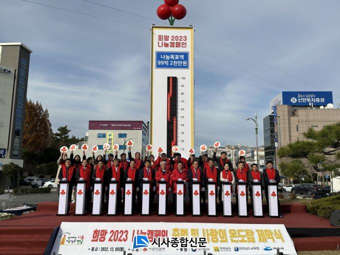 À̳¯ ±âºÎ±Ý Àü´Þ½Ä¿¡¼± ¹Ú¼ºÇö »çÀåÀÌ »ç¶ûÀÇ ¿Â±â¸¦ Àü´ÞÇØ ¸ð±ÝÀÇ ½ÃÀÛÀ» ¾Ë·ÈÀ¸¸ç, Á¤±â¸í ¿©¼ö½ÃÀå°ú ±è¿µ±Ô ¿©¼ö½ÃÀÇÀå, ³ëµ¿ÀÏ Àü³²»çȸº¹Áö°øµ¿¸ð±ÝȸÀåÀÇ Ãà»ç¿Í »ç¶ûÀÇ ¿Âµµ ¿Ã¸®±â ÆÛÆ÷¸Õ½ºµµ ÁøÇàµÆ´Ù.