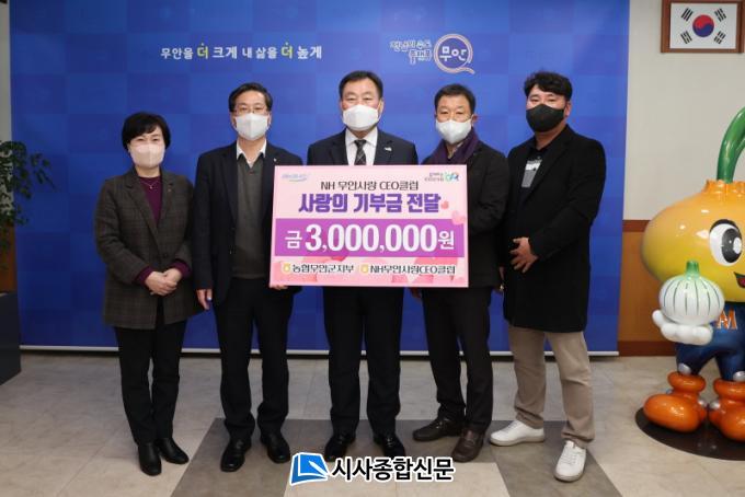 [½Ã»çÁ¾ÇսŹ® = ¿À½ÂÅà ±âÀÚ] ¹«¾È±º(±º¼ö ±è»ê)Àº Áö³ 12ÀÏ NH³óÇù ¹«¾È±ºÁöºÎ(ÁöºÎÀå ÀÓÁ¤ºó)¿Í ³óÇù °Å·¡ ±â¾÷ü °æ¿µÀεé·Î ±¸¼ºµÈ NH¹«¾È»ç¶û CEOŬ·´(ȸÀå ¾Èö¼ö)À¸·ÎºÎÅÍ »ç¶ûÀÇ ±âºÎ±Ý 300¸¸¿øÀ» ±âŹ ¹Þ¾Ò´Ù.