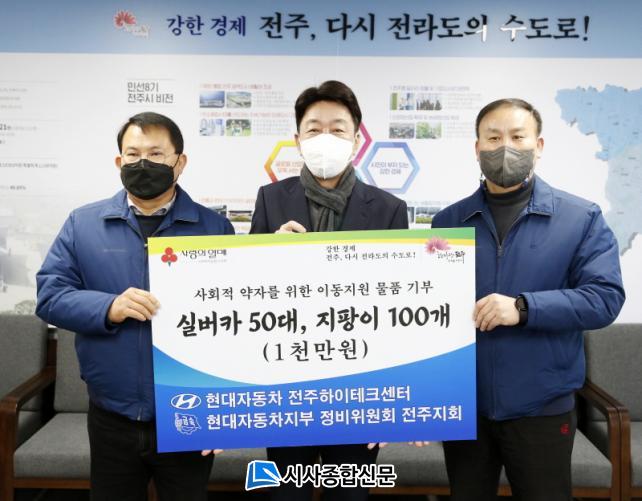 [½Ã»çÁ¾ÇսŹ® = ¿À½ÂÅà ±âÀÚ] Çö´ëÀÚµ¿Â÷ ÀüÁÖ ÇÏÀÌÅ×Å©¼¾ÅÍ ³ë»ç(¼¾ÅÍÀå 亴µÎ, ³ëÁ¶ÁöȸÀå À̵¿ÇÏ)´Â 27ÀÏ ¾î·Á¿òÀ» °Þ°í ÀÖ´Â »çȸÀû ¾àÀÚ¸¦ À§ÇØ »ç¿ëÇØ´Þ¶ó¸ç 1000¸¸ ¿ø »ó´çÀÇ Àå¾ÖÀÎ À̵¿Áö¿ø ¹°Ç°À» ÀüÁֽÿ¡ ±âºÎÇß´Ù.