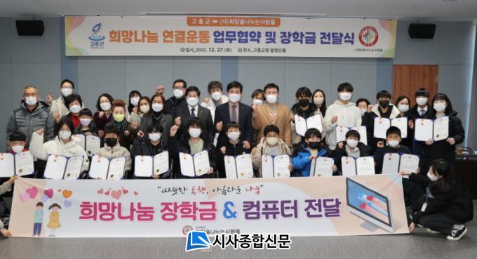 ÀÌ Çù¾à¿¡ µû¶ó »ç´Ü¹ýÀÎÀº °íÈﱺ¿¡ 2³â°£ ÃÑ 2¾ï 2,280¸¸¿ø »ó´çÀÇ ÀåÇбݰú ¹°Ç°À» Áö¿øÇÏ°Ô µÇ¸ç, ±× Áß 1,800¸¸¿øÀÇ ÀåÇбݰú 240¸¸¿ø »ó´çÀÇ ÄÄÇ»Å͸¦ À̹ø Çù¾à½Ä¿¡¼ °ü³» 19¸íÀÇ Çлý¿¡°Ô Á÷Á¢ Àü´ÞÇß´Ù.