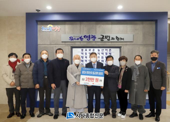 Áö³ 19ÀÏ ¿µ±¤±ºÃ» ±º¼ö½Ç¿¡¼ °Á¾¸¸ ¿µ±¤±º¼ö, ºÒ°©»ç ÁÖÁö ¸¸´ç½º´Ô, ¹Ú¼º±â ¸¶¶ó³Å¸ºÒ±³´ëÇе¿¹®È¸Àå ¹× °ü°èÀÚ°¡ Âü¼®ÇÑ °¡¿îµ¥ Àü´Þ½ÄÀ» °¡Á³À¸¸ç, À̳¯ Àü´ÞµÈ ¼º±ÝÀº ¿µ±¤±º Àú¼ÒµæÃþ¿¡ »ç¿ëµÉ ¿¹Á¤ÀÌ´Ù.