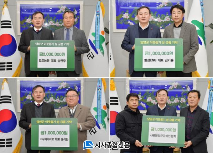 ´ã¾ç±º¿¡ µû¸£¸é °¨·Î³óÀå ¼ÛÀÎÁÖ ´ëÇ¥°¡ Çö±Ý 200¸¸¿øÀ», ÇѼºENG(´ëÇ¥ ±è±â¿ë)¿Í (ÁÖ)¿ìÅØ¹ÙÀÌ¿À(´ëÇ¥ À±¼®ÇÑ), (»ç)´ã¾ç±º°ø¿¹ÀÎÇùȸ(´ëÇ¥ Ç㹫)¿¡¼ Çö±Ý 100¸¸ ¿øÀ» ±âŹÇϸç ÀÌ¿ô¿¡°Ô »ç¶ûÀ» ÀüÇÏ´Â ³ª´® Ȱµ¿À» ½ÇõÇß´Ù.