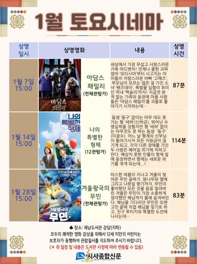 ÇÑÆí, ¼±Á¤µÈ ¿µÈ´Â ¸ÅÁÖ Åä¿äÀÏ ¿ÀÈÄ 3½Ã µµ¼°ü °´ç¿¡¼ ¹«·á »ó¿µµÇ¸ç, ÀÚ¼¼ÇÑ ÀÏÁ¤Àº ºÙÀÓÀÚ·á ¹× È¨ÆäÀÌÁö(http://www.jnlib.go.kr)¸¦ Âü°íÇϰųª ÀüÈ(T.766-4600)·Î ¹®ÀÇÇÏ¸é µÈ´Ù.