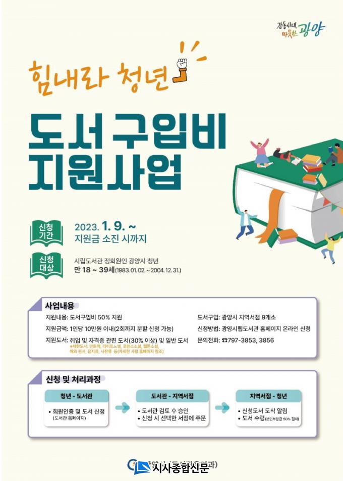 ±¤¾ç½Ã¸³µµ¼°ü¿¡ Á¤È¸¿øÀ¸·Î µî·ÏµÈ û³âÀÌ¸é ´©±¸³ª ½ÅûÇÒ ¼ö ÀÖÀ¸¸ç, û³â 1Àδç 10¸¸ ¿ø±îÁö(2ȸ ºÐÇÒ ½Åû °¡´É) Áö¿øÇϸç, º»ÀÎ ºÎ´ã±Ý(µµ¼ ±¸ÀÔºñÀÇ 50%)À» ÇÕÇϸé ÃÖ´ë 20¸¸ ¿ø±îÁö µµ¼¸¦ ±¸ÀÔÇÒ ¼ö ÀÖ´Ù.