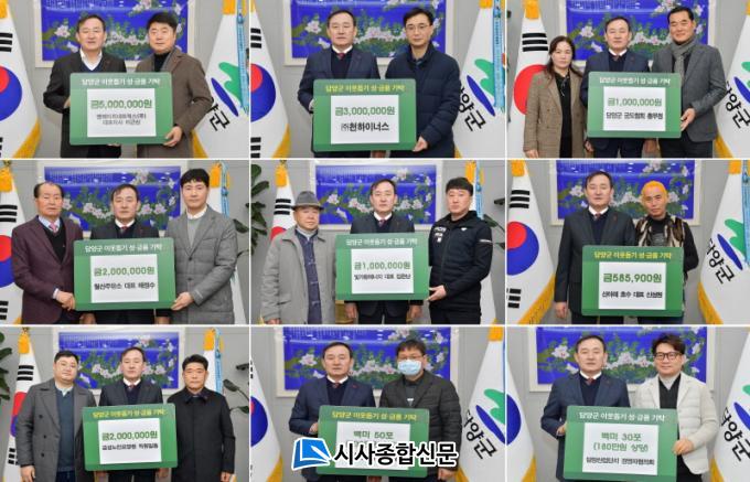 ´ã¾ç±º¿¡ µû¸£¸é ¿£¿¡ÀÌÄ¡³×Æ®¿÷½º(ÁÖ) À̱ٽŠ´ëÇ¥À̻簡 500¸¸¿øÀ» ±âŹÇßÀ¸¸ç, (ÁÖ)õÇÏÀ̳ʽº(´ëÇ¥ ±èÇÐ) 300¸¸¿ø, ±Ý¼º³ëÀοä¾ç¿ø Á÷¿ø Àϵ¿ 200¸¸¿ø, ´ã¾ç±º±ÃµµÇùȸ Ãѹ«Á¤ 100¸¸¿ø, ¿ù»êÁÖÀ¯¼Ò ¹èÁ¤¼ö ´ëÇ¥ 200¸¸¿ø, ºû°¡¶÷ ¿¡³ÊÁö ±èÂù¶õ ´ëÇ¥ 100¸¸¿ø, »ê¾Æ·¡È£¼ö ½Å¼º¿ø ´ëÇ¥°¡ 58¸¸¿øÀ» ±âŹÇß´Ù.