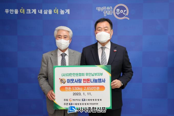 À̹ø Çà»ç´Â (»ç)´ëÇÑÇѵ·Çùȸ ¹«¾È³²ºÎÁöºÎ(ÁöºÎÀå ½Å±æ¿À) ȸ¿ø 20¿©¸íÀÌ Âü¿©ÇßÀ¸¸ç µ¶°Å³ëÀεé°ú ¼Ò¿Ü°èÃþÀÌ °Ç°ÇÑ °Ü¿ï³ª±â¿Í µû¶æÇÑ ¼³¸íÀý º¸³»±â¿¡ º¸ÅÆÀÌ µÇ°íÀÚ µÅÁö°í±â 440kg(530¸¸¿ø »ó´ç)À» ¹«¾È±º¿¡ Àü´ÞÇß´Ù.
