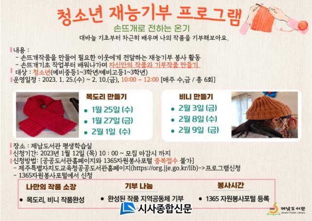 ¼ö° ½ÅûÀº û¼Ò³â(¿¹ºñÁßµî1~3Çгâ/¿¹ºñ°íµî1~3Çгâ), 15¸íÀ» ´ë»óÀ¸·Î Çϸç Á¦ÁÖÆ¯º°ÀÚÄ¡µµ±³À°Ã»°ø°øµµ¼°ü ȨÆäÀÌÁö(https://org.jje.go.kr/lib/index.jje)»ó´Ü¸Þ´º [ÇÁ·Î±×·¥ ½Åû] ¶Ç´Â 1365ÀÚ¿øºÀ»çÆ÷Åп¡¼ 1¿ù 12ÀÏ(¸ñ) 10½ÃºÎÅÍ ½Åû °¡´ÉÇÏ´Ù.